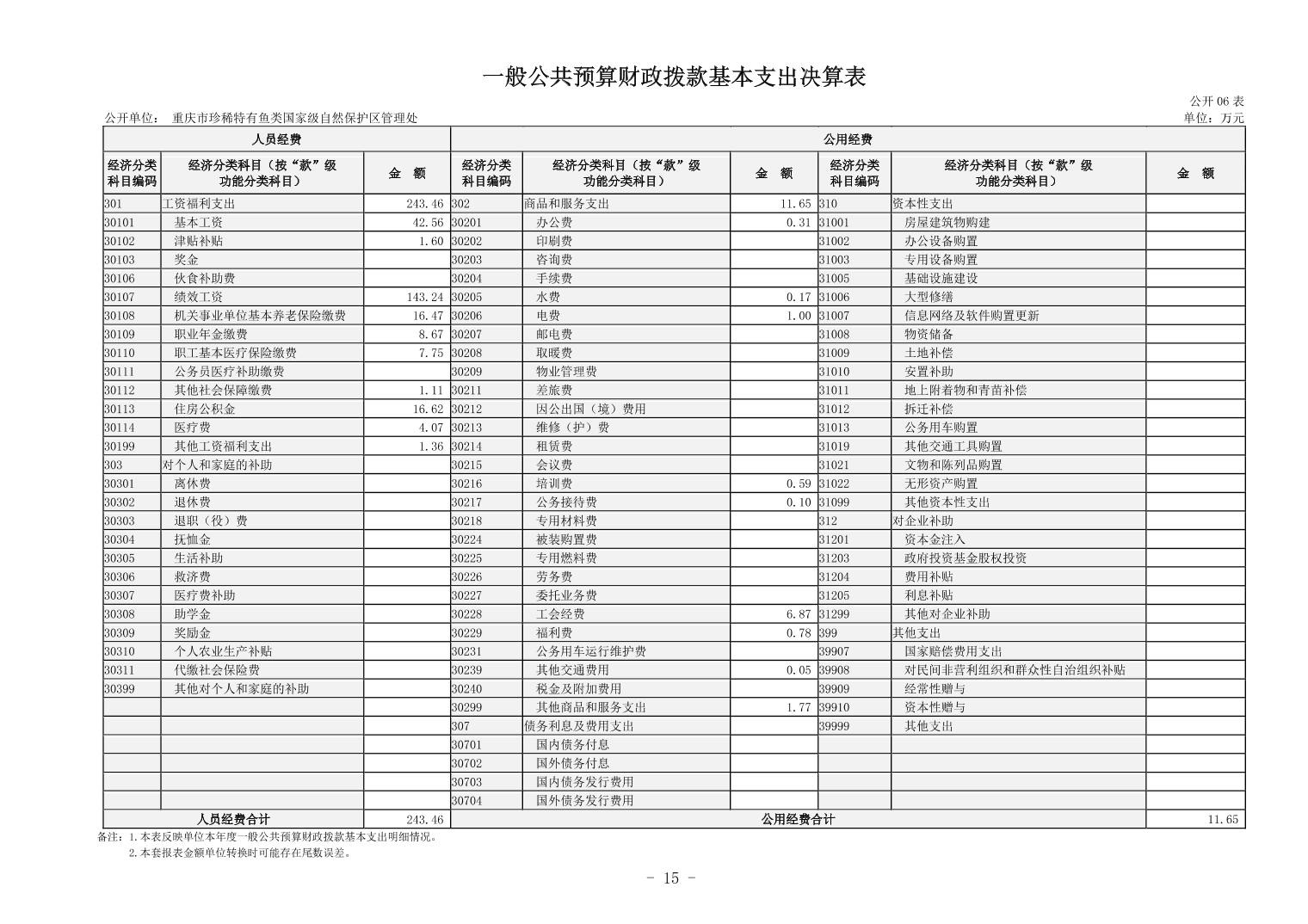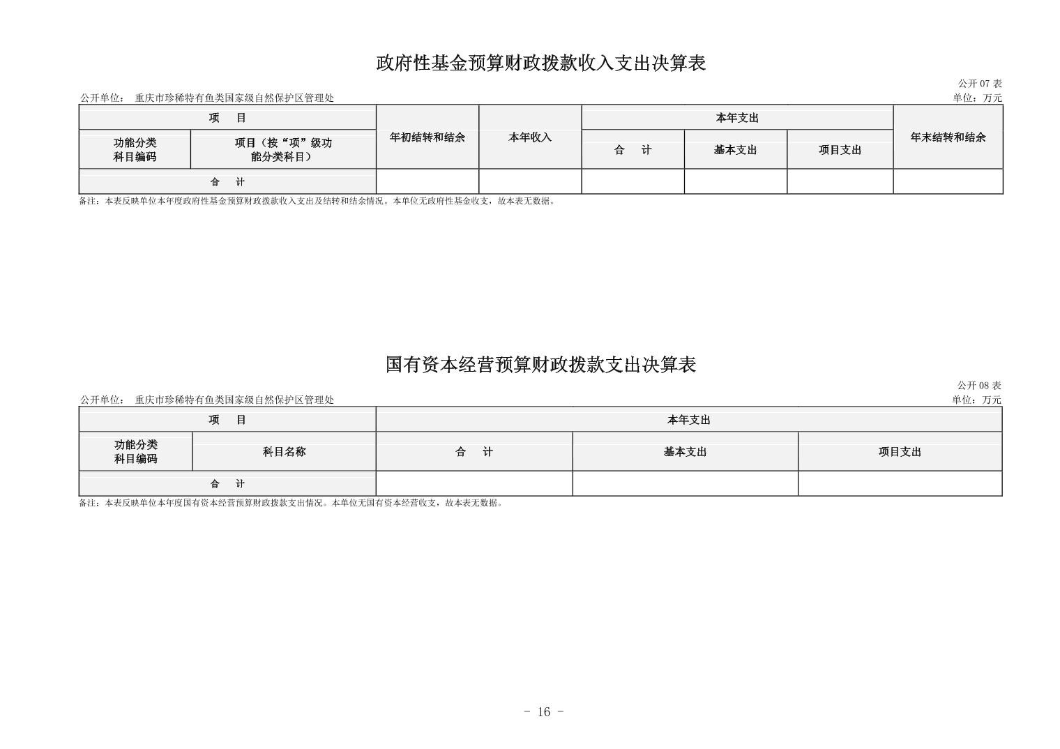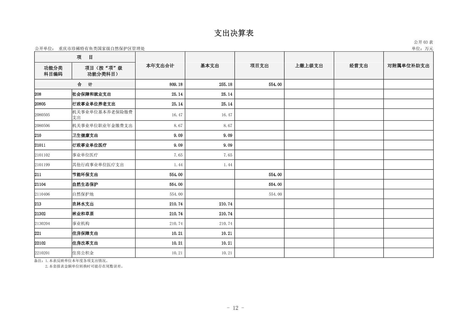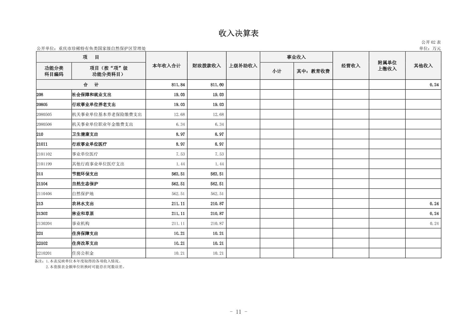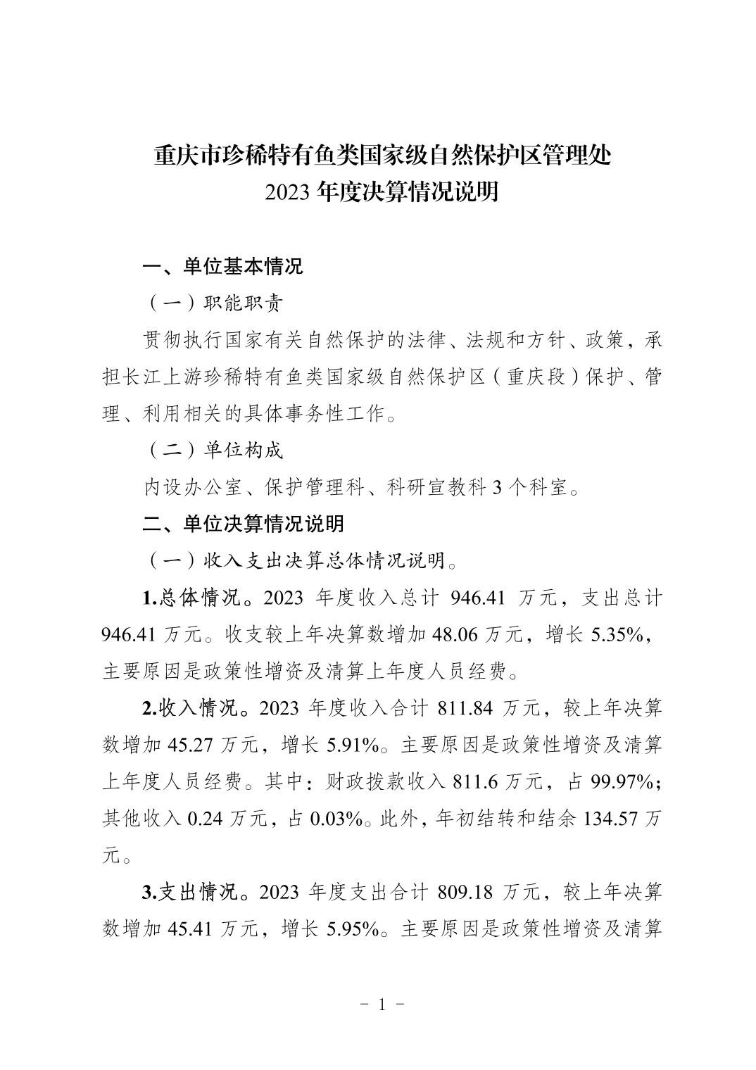 重庆市珍稀特有鱼类国家级自然保护区管理处决算公开说明及公开报表