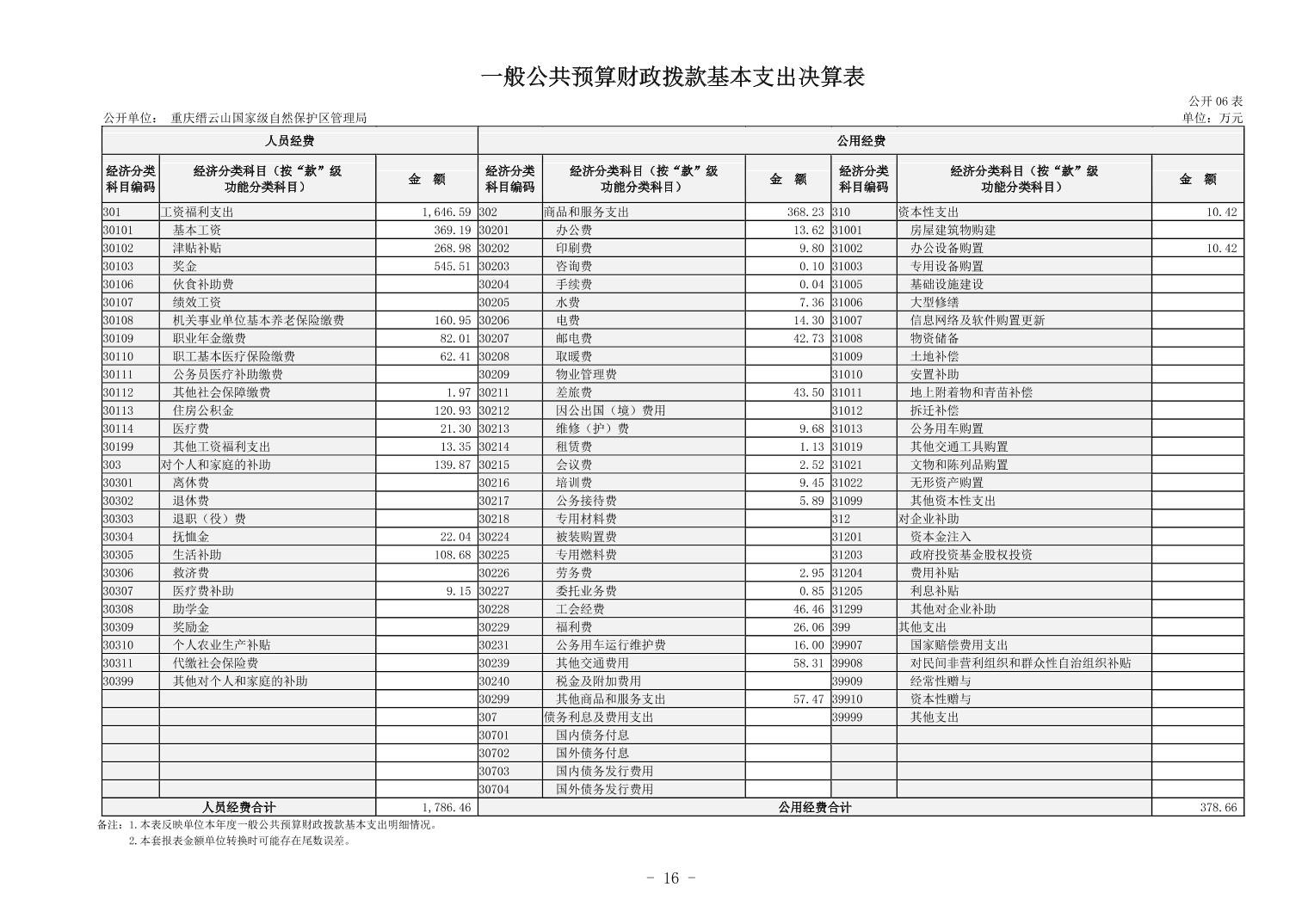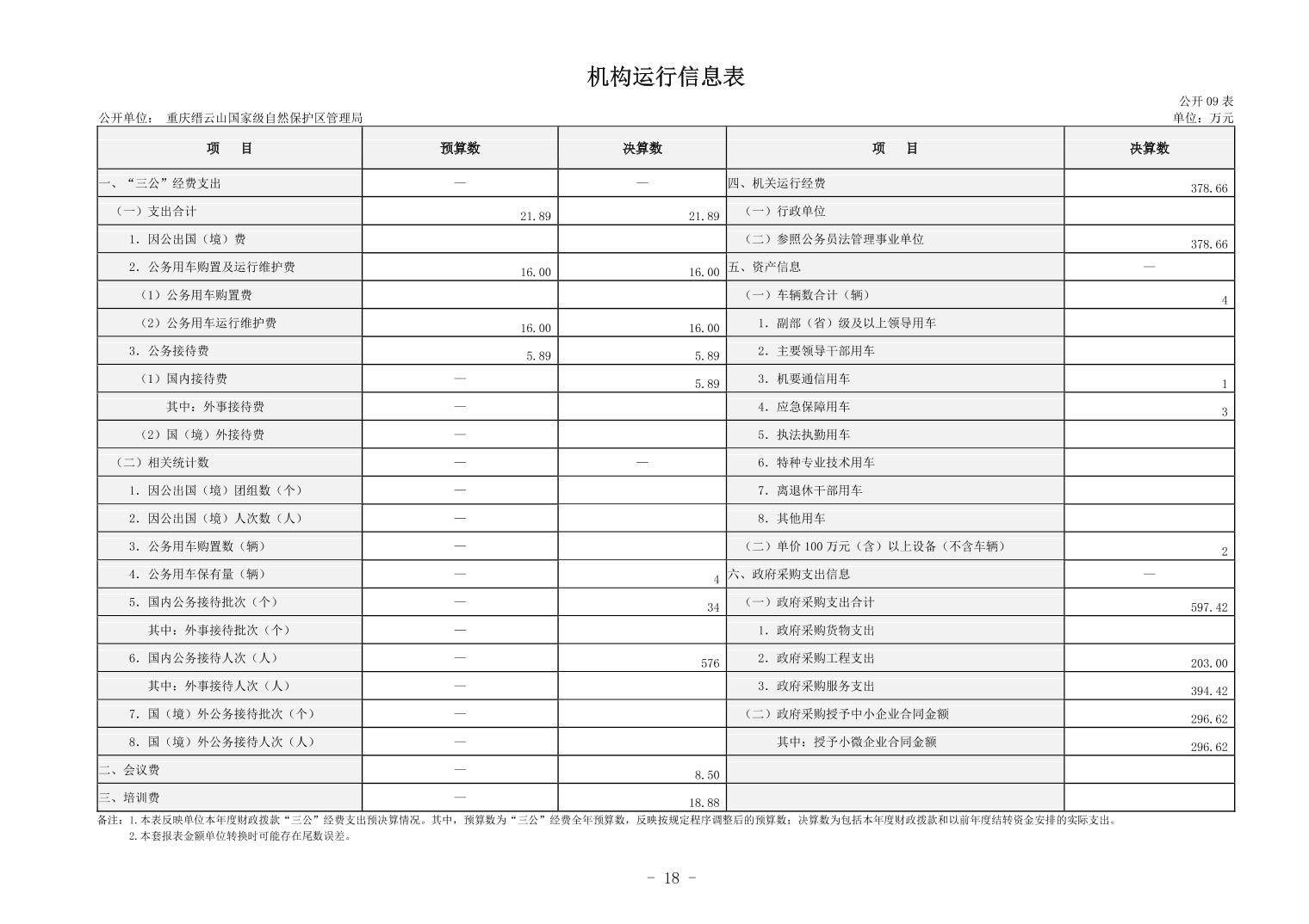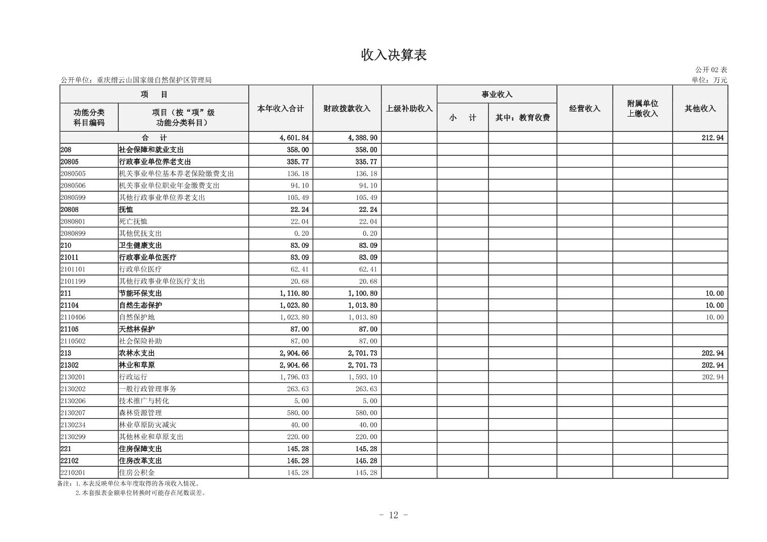 重庆缙云山国家级自然保护区管理局决算公开说明及公开报表
